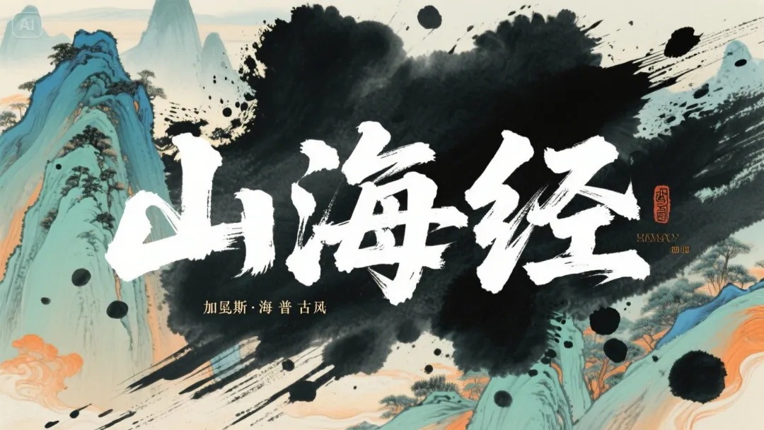 文字内容为“山海经”,采用水墨中国风的字体设计。背景为泼墨山水画,墨色晕染效果突出,呈现出浓厚的艺术气息。字体具有飞白留笔的感觉,体现出古风海报的排版风格,整体呈现高清插画的视觉效果。