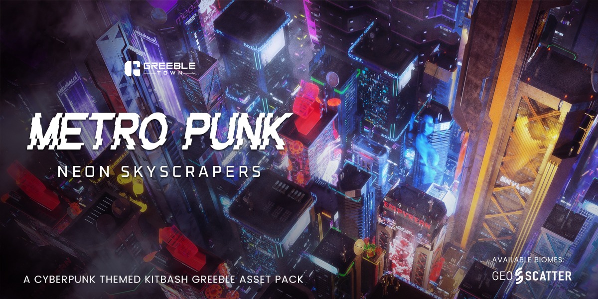 Blender未来科技风格赛博朋克霓虹城市摩天大楼建筑3D模型资产预设 Metropunk Neon Skyscrapers